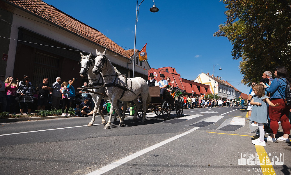 Do enajste ure se je Glavna ulica napolnila z obiskovalci, ko je čez mesto krenila tudi povorka okrašenih vozov, konjskih vpreg, nekateri pa so svoja naselja predstavljali kar peš ali na kolesih. Poleg domačih vasi so bile zastopane tudi skupine iz Madžarske, Hrvaške in Srbije. Na vozovih, ki so jih vlekli traktorji in konjskih vpregah so moški, ženske in otroci v narodnih nošah prikazali različne ljudske običaje in stare dejavnosti. Poleg opravil in običajev, povezanih s trgatvijo, smo lahko videli tudi zabavno predstavitev starih obrti.